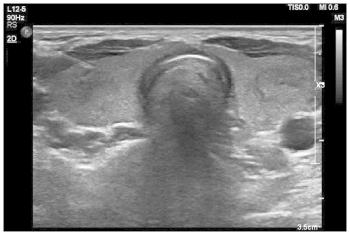 Thyroid Ultrasound Finding Diffuse Heterogenous Low Echogenicity Of Download Scientific Diagram